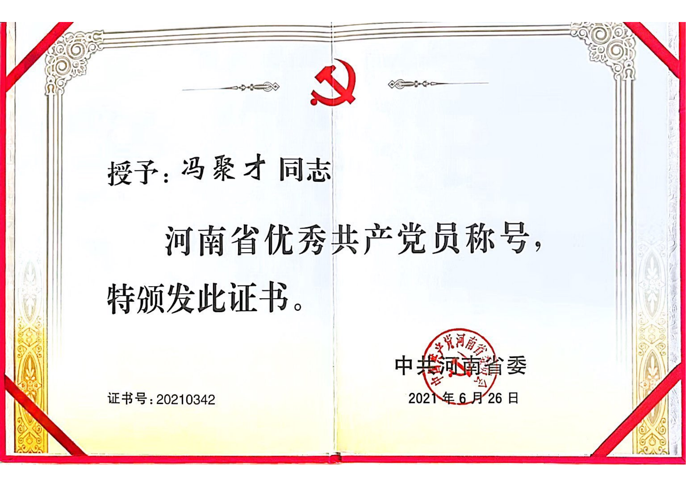 獲河南省優(yōu)秀共產(chǎn)黨員榮譽(yù)稱號