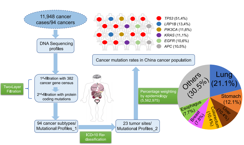 該研究收集并整理分析了2004年至2016年中國國家癌癥中心共556萬的癌癥流行病學數據。文中分析了23種癌癥類型(共包括94種腫瘤亞型,11,948例癌癥患者)中382個腫瘤相關基因中可影響編碼蛋白序列的基因突變。通過把腫瘤基因測序數據與流行病學數據進行融合分析,得出在中國癌癥人群中排名前十的突變基因為TP53 (51.4%),LRP1B(13.4%),PIK3CA (11.6%), KRAS (11.1%), EGFR (10.6%), APC (10.5%), KMT2D (9.7%), KMT2C (8.8%), ARID1A (8.4%), and FAT4 (7.7%)。其中在中國人群中突變頻率最高的基因為TP53 (51.4%),即超過一半的癌癥患者的腫瘤組織攜帶有TP53突變。通過對中國的突變頻率與美國的癌癥基因突變頻率進行對比分析發現,中國癌癥患者TP53 (51.4%) 及 EGFR (10.6%) 等癌癥基因的突變頻率要遠高于美國腫瘤患者的TP53 (34.0 %) 及 EGFR (3.1%)突變頻率。通過分析發現TP53的差異主要是來自于中國的非小細胞肺癌,胃癌,食管癌,及肝癌中TP53的高突變率。該研究通過性別及吸煙狀態的分層分析,發現EGFR的差異則主要來自于肺癌EGFR的高突變率,其中中國非吸煙女性的肺癌患者中EGFR的突變頻高達70.7%。