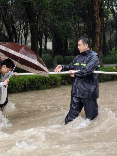 暴雨如注,水深路險,工作人員戶航、任彬帶領安保人員和學生志愿者,跳入了洪水中,在水流湍急處,用消防水帶為師生拉起了“安全繩”,筑起了“生命線”。鞋子沖走了,就光腳;腳扎破了,雨水沖洗下繼續奮戰。受助學生紛紛表示:“水很深,風很大,因為有你們,我們不怕”。